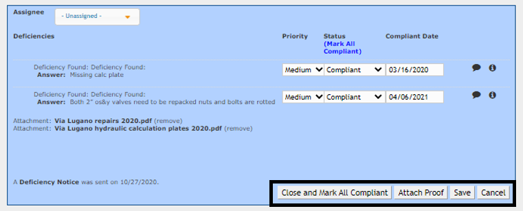Step 6: To accept that these deficiencies have been repaired or corrected, click on “Close and Mark All Compliant." If only one deficiency is corrected, mark it compliant and leave the other deficiency open by clicking, "Save."